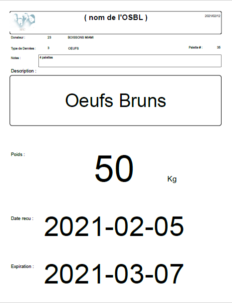 Cette fonction permet d'inscrire toutes les informations relatives aux réceptions des denrées; sélectionnez le donateur parmi la liste des donateurs inscrits, le type de denrée reçue (denrées sèches, produits laitiers, viandes, fruits et légumes, etc.), le poids et une note optionnelle. Vous pouvez alors imprimer une fiche pouvant être apposée sur la palette reçue.