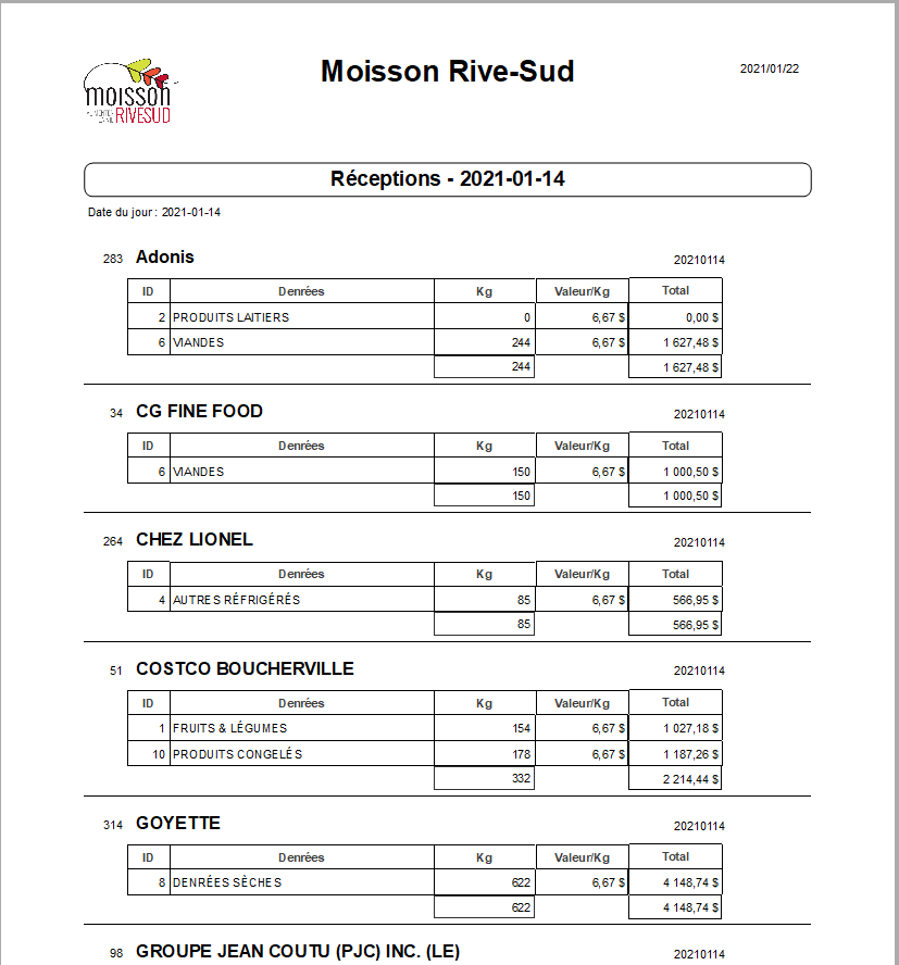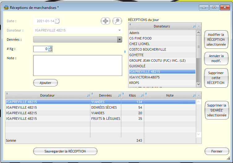 Toutes les réceptions du jour peuvent être modifiées, soit pour y ajouter une nouvelle entrée, en supprimer une ou en corriger les détails. L'administrateur a aussi la possibilité de corriger des réceptions antérieures.