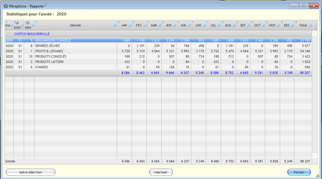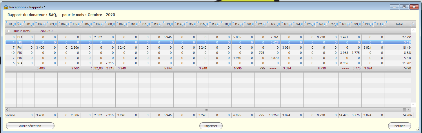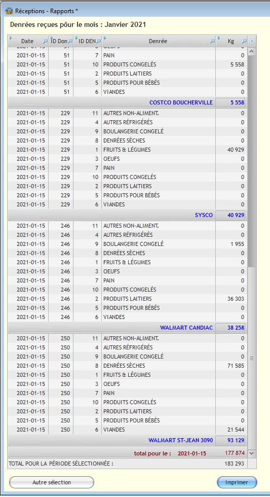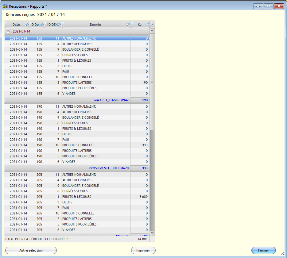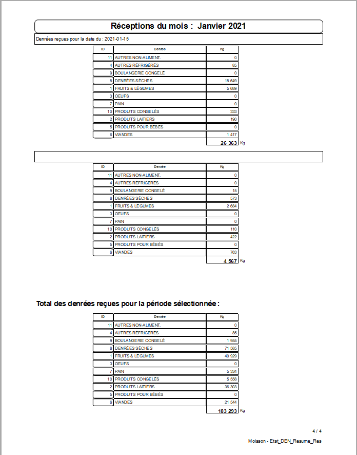 - Denrées: par jour, semaine, mois, année ou intervalle de dates.