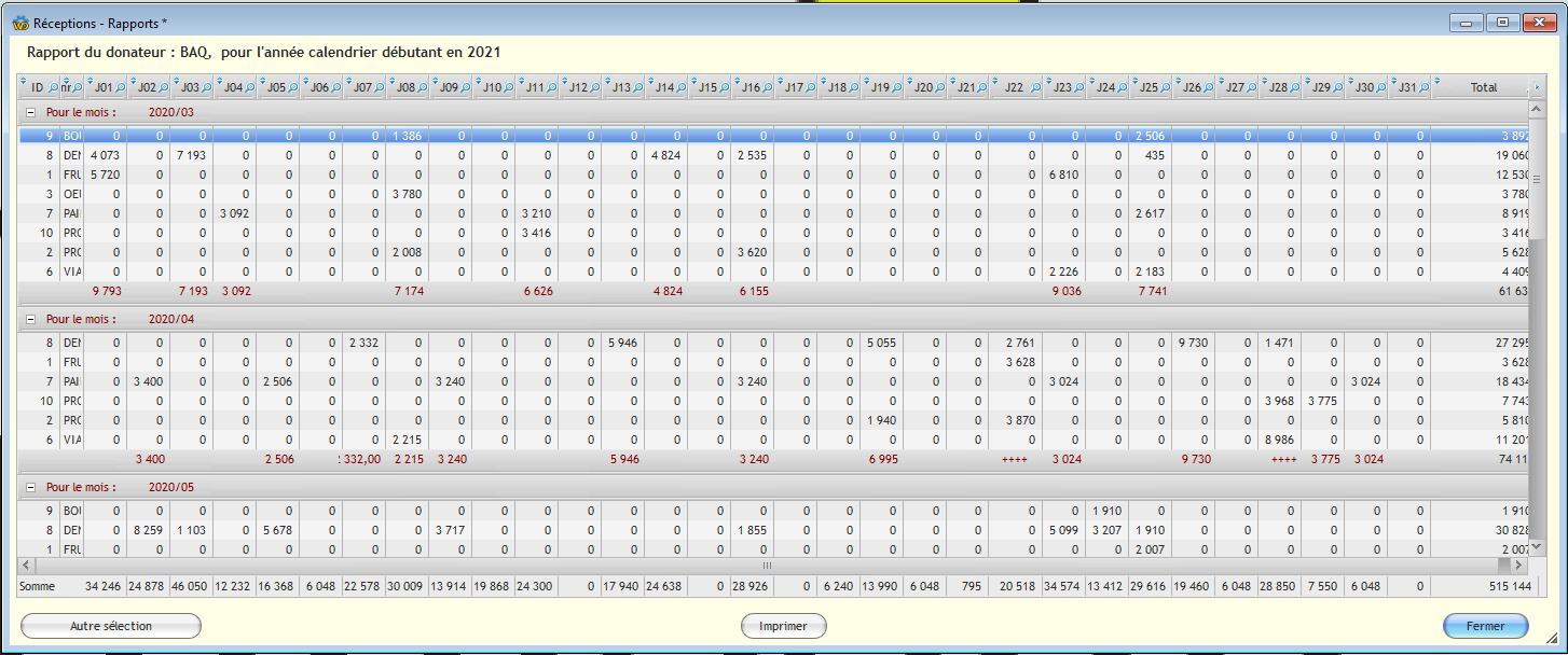- Donateurs: par mois, année (fiscale ou calendrier)
